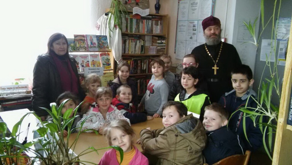 28 марта 2019 г. в библиотеке Журавичской средней школы состоялась беседа протоиерея Анатолия Апончика с учащимися, посещающими школьный оздоровительный лагерь. Священник рассказал ребятам об истории книгопечатания, о важности знакомства с православной культурой через чтение книг.